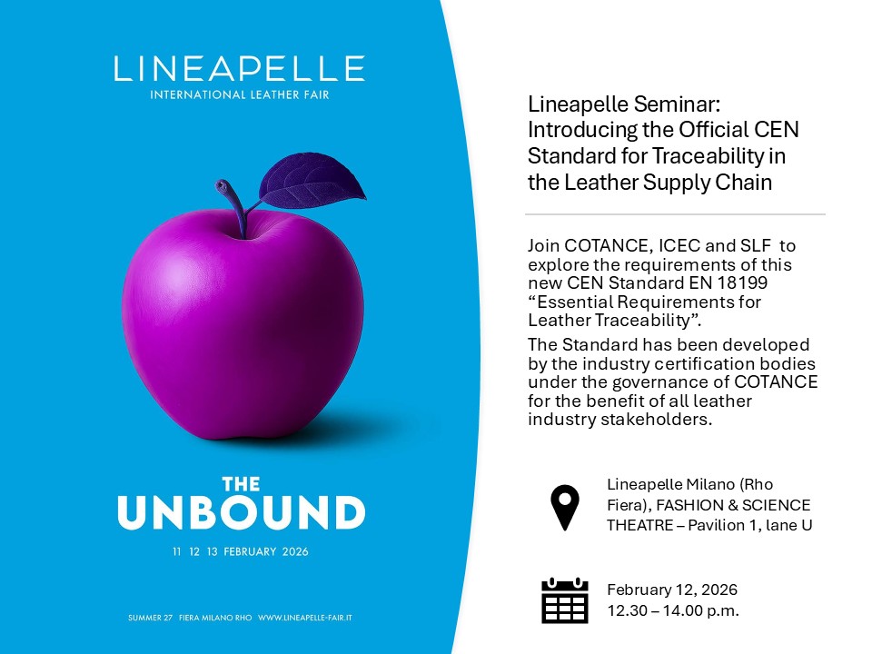 Lineapelle Seminar: Introducing the Official CEN Standard for Traceability in the Leather Supply Chain Join COTANCE, ICEC and SLF to explore the requirements of this new CEN Standard EN 18199 “Essential